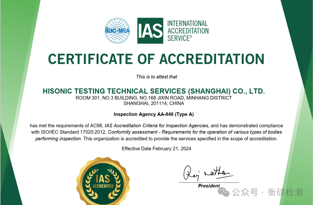 近日,我司已取得IAS颁发的ISO17020检验机构资质证书。这是对我们长期坚持标准化管理的一种认可,也是对衡硕检测团队专业实力的充分肯定。