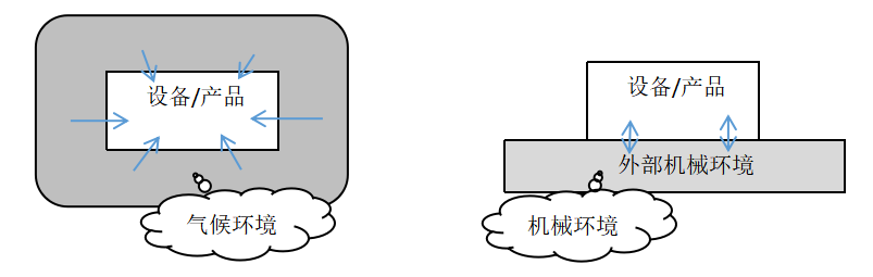 一个方面为机械环境,主要为“冲击、振动、跌落、倾斜、摇摆、颠振、爆炸冲击、地震”等。气候环境和机械环境对设备/产品的作用如图1所示。
